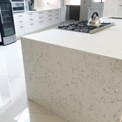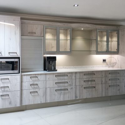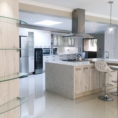 The colour palette for this kitchen was on the pale side, so we decided to keep up the visual interest by using a mixture of styles and textures. The melamine doors are covered in the colour Nordic Ice and finished off with solid stainless steel handles to match the appliances. This spacious kitchen is full of custom cupboards to specifically fit the needs of our client.