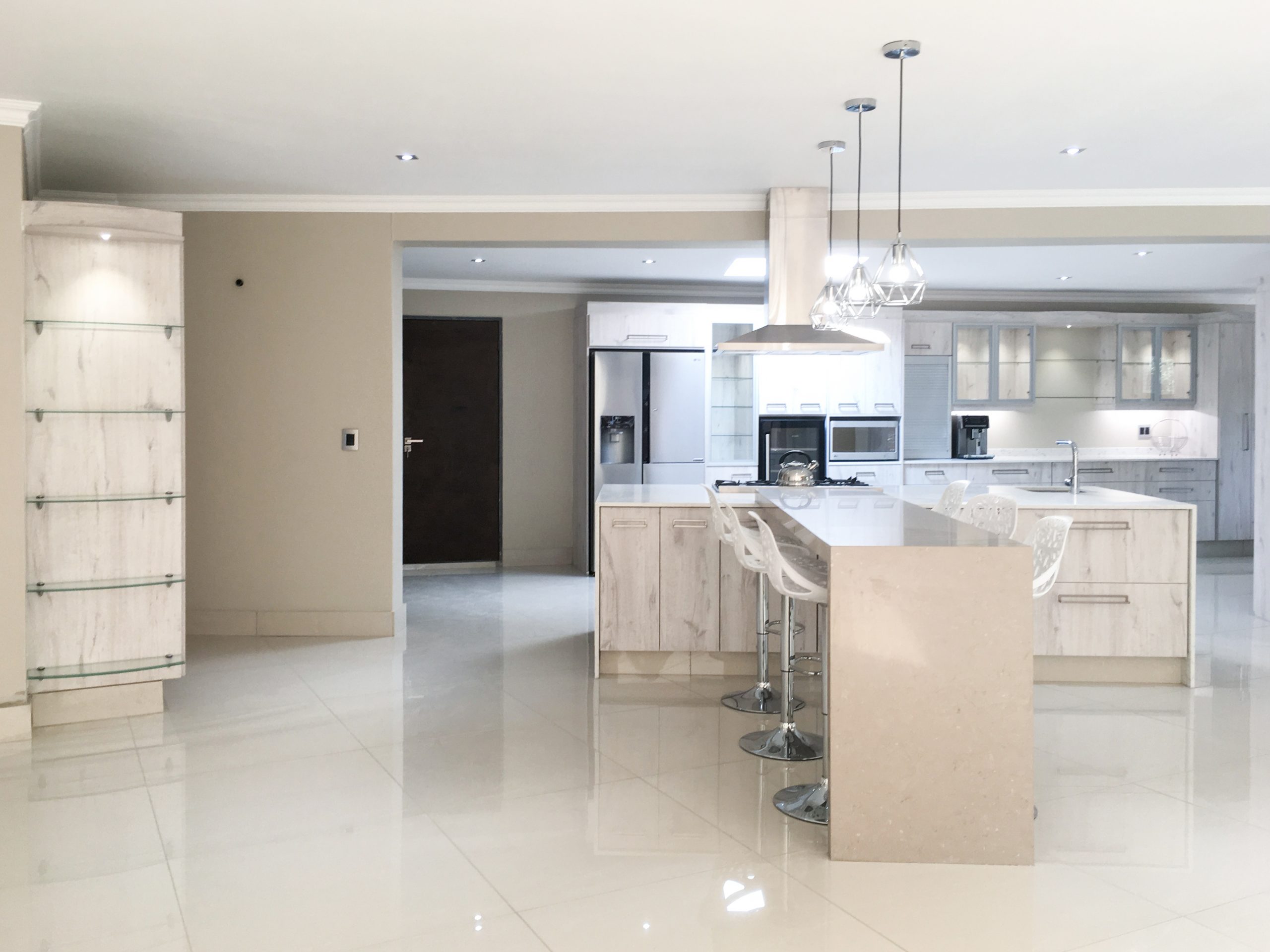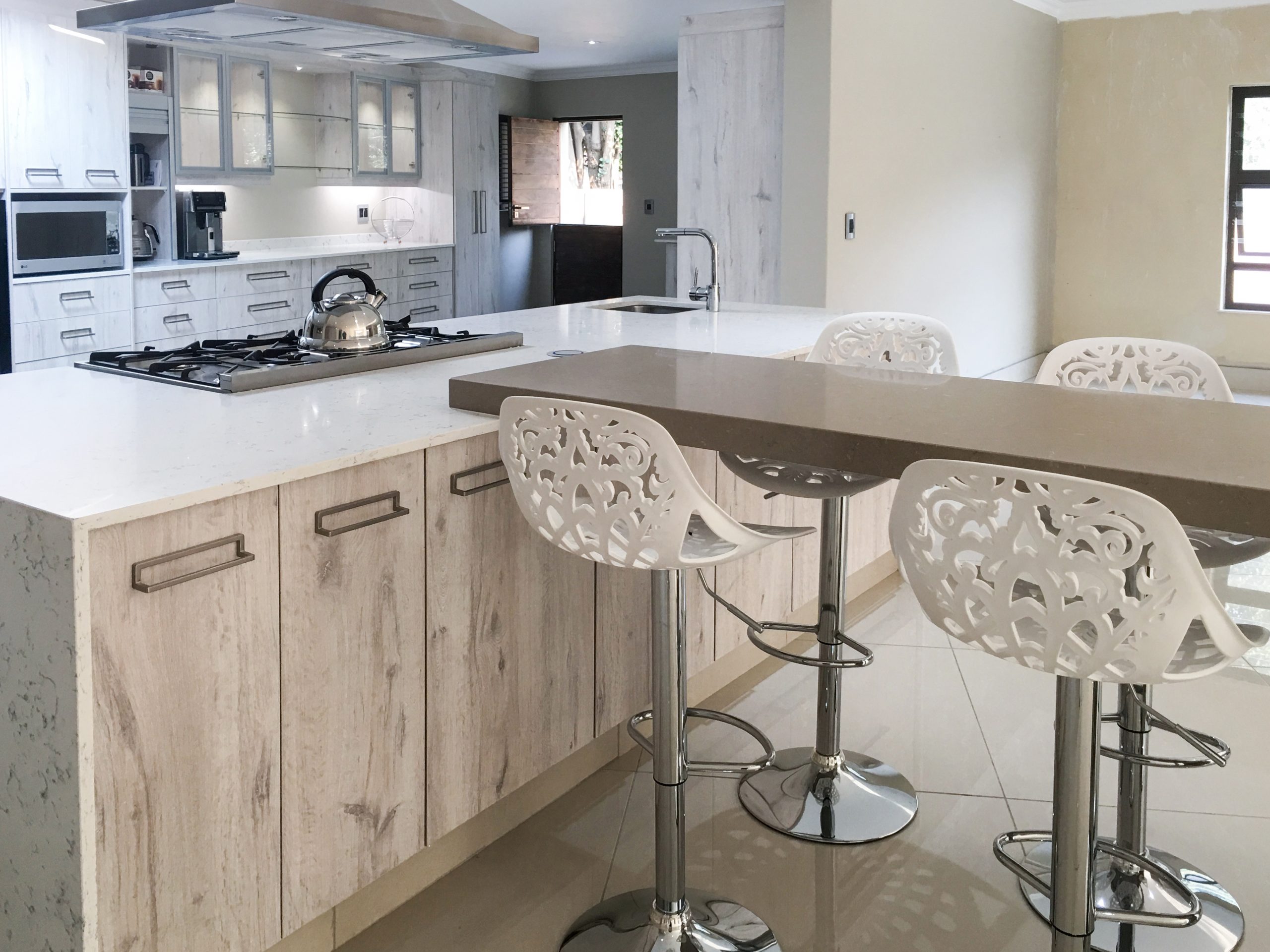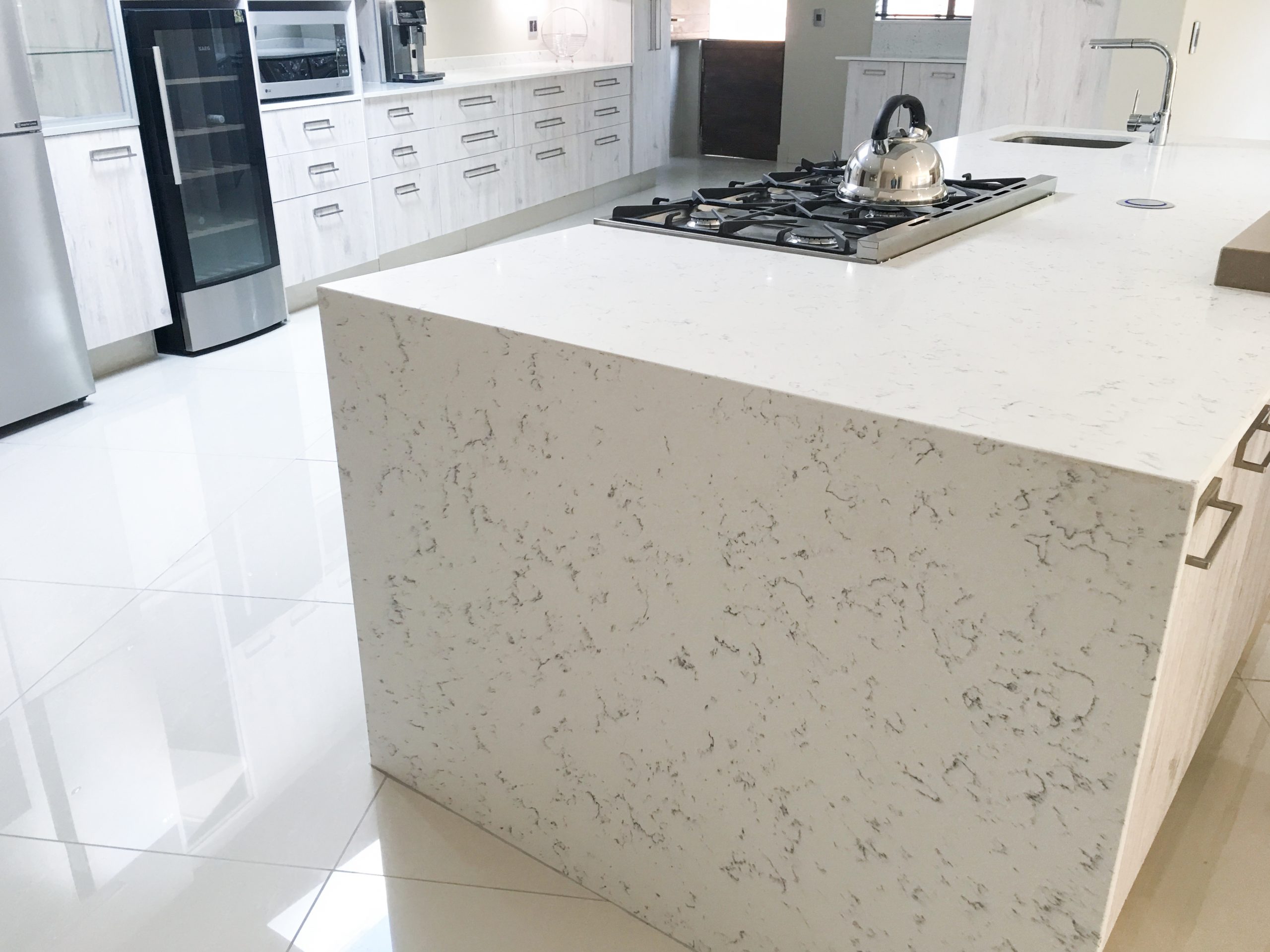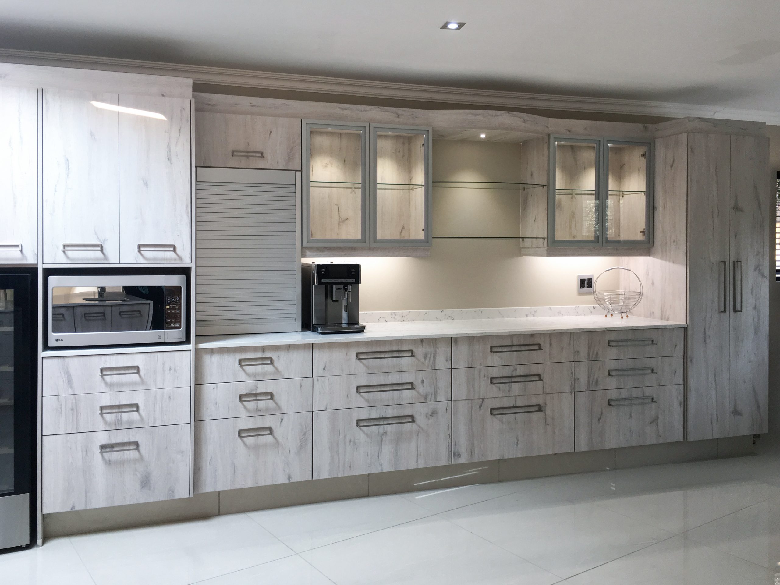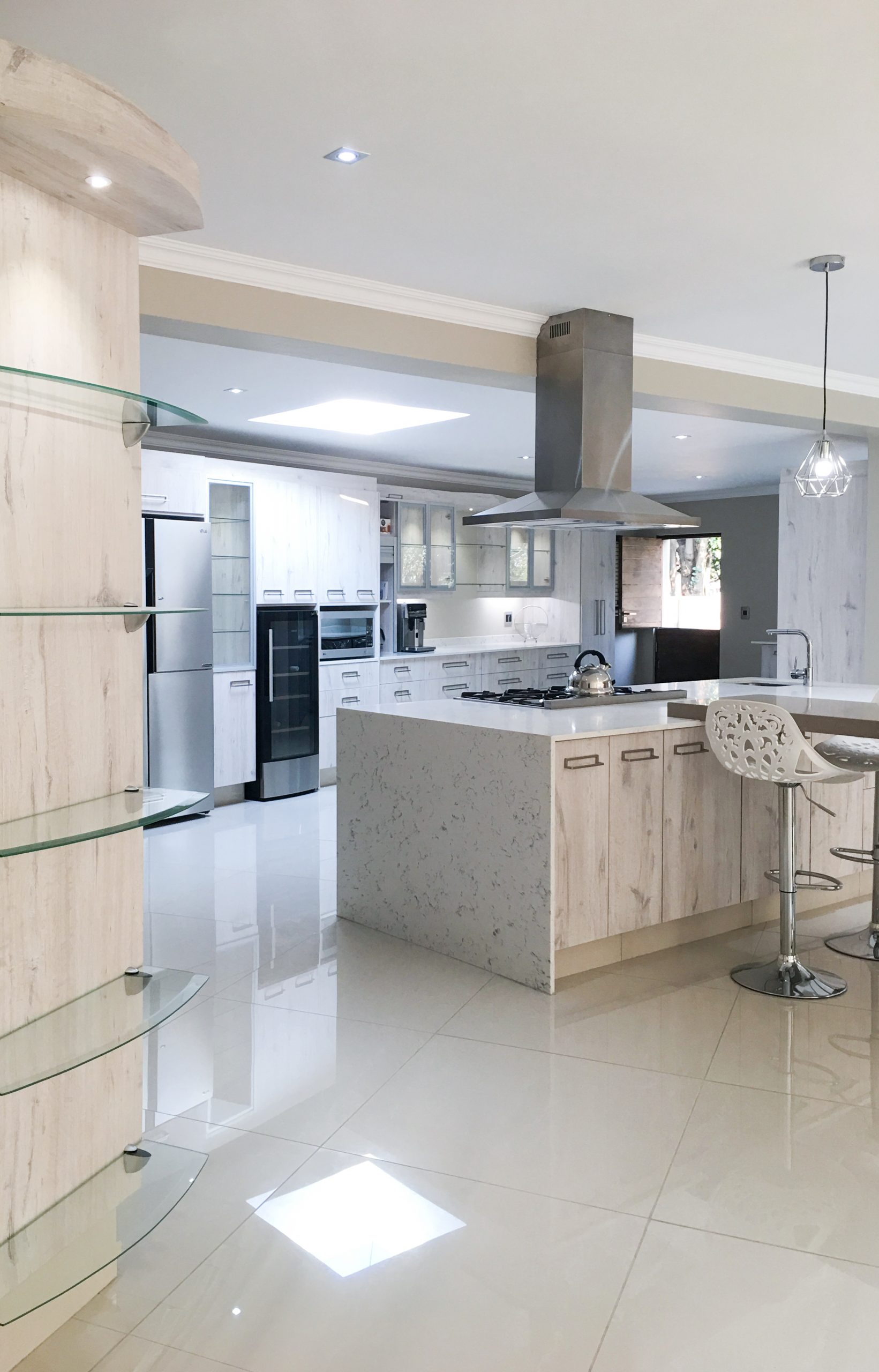 The colour palette for this kitchen was on the pale side, so we decided to keep up the visual interest by using a mixture of styles and textures. The melamine doors are covered in the colour Nordic Ice and finished off with solid stainless steel handles to match the appliances. This spacious kitchen is full of custom cupboards to specifically fit the needs of our client.