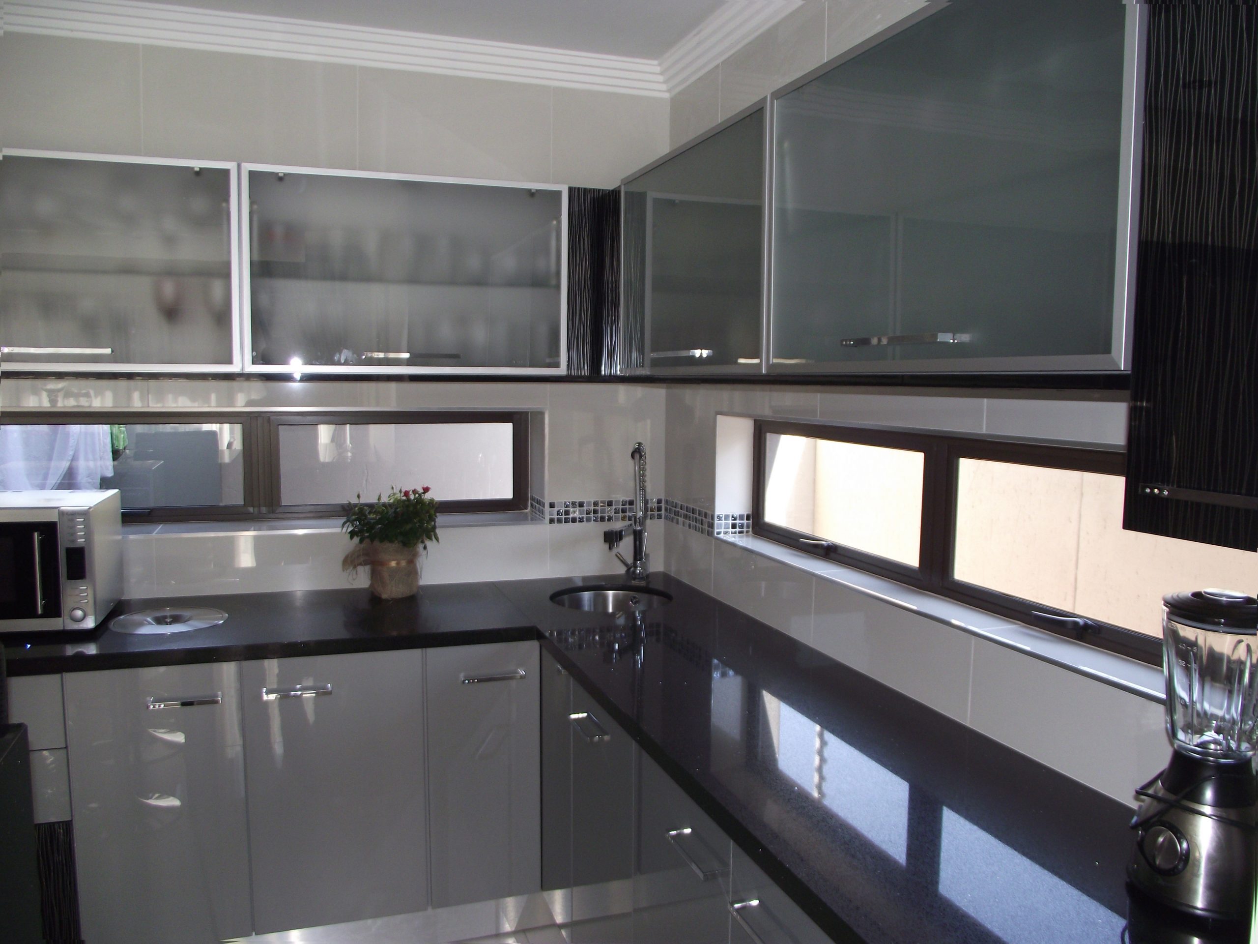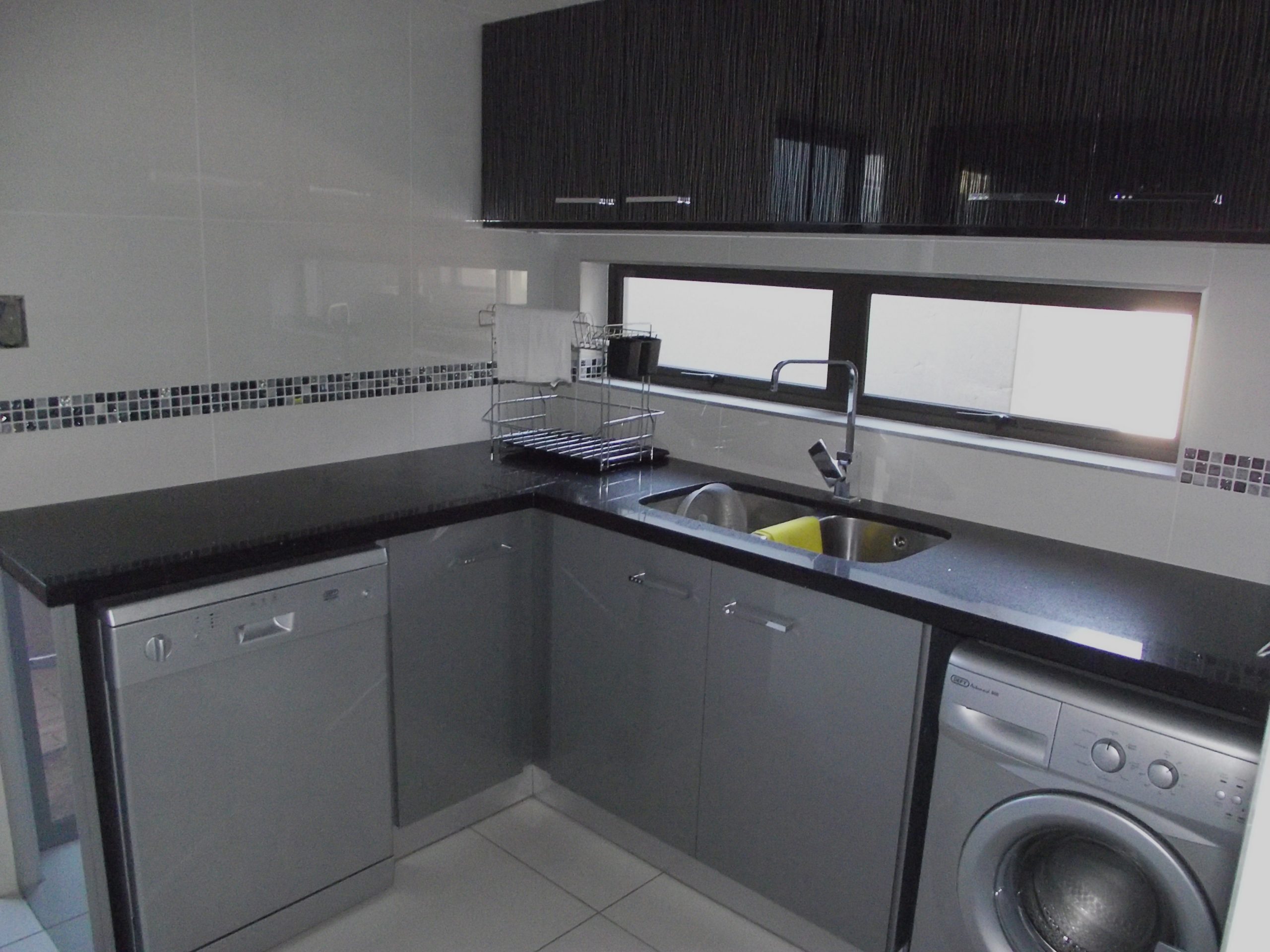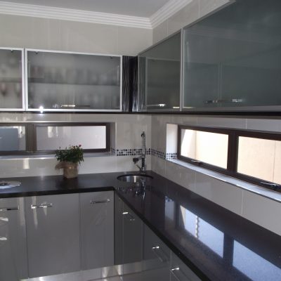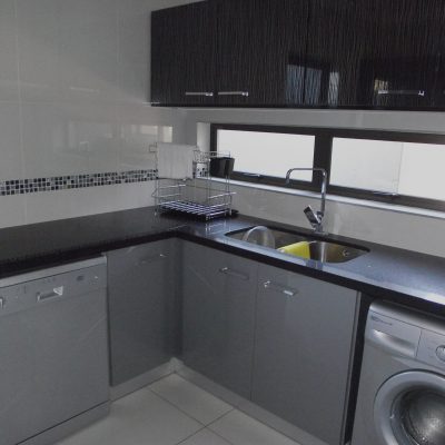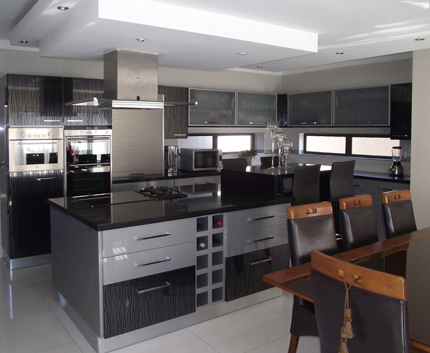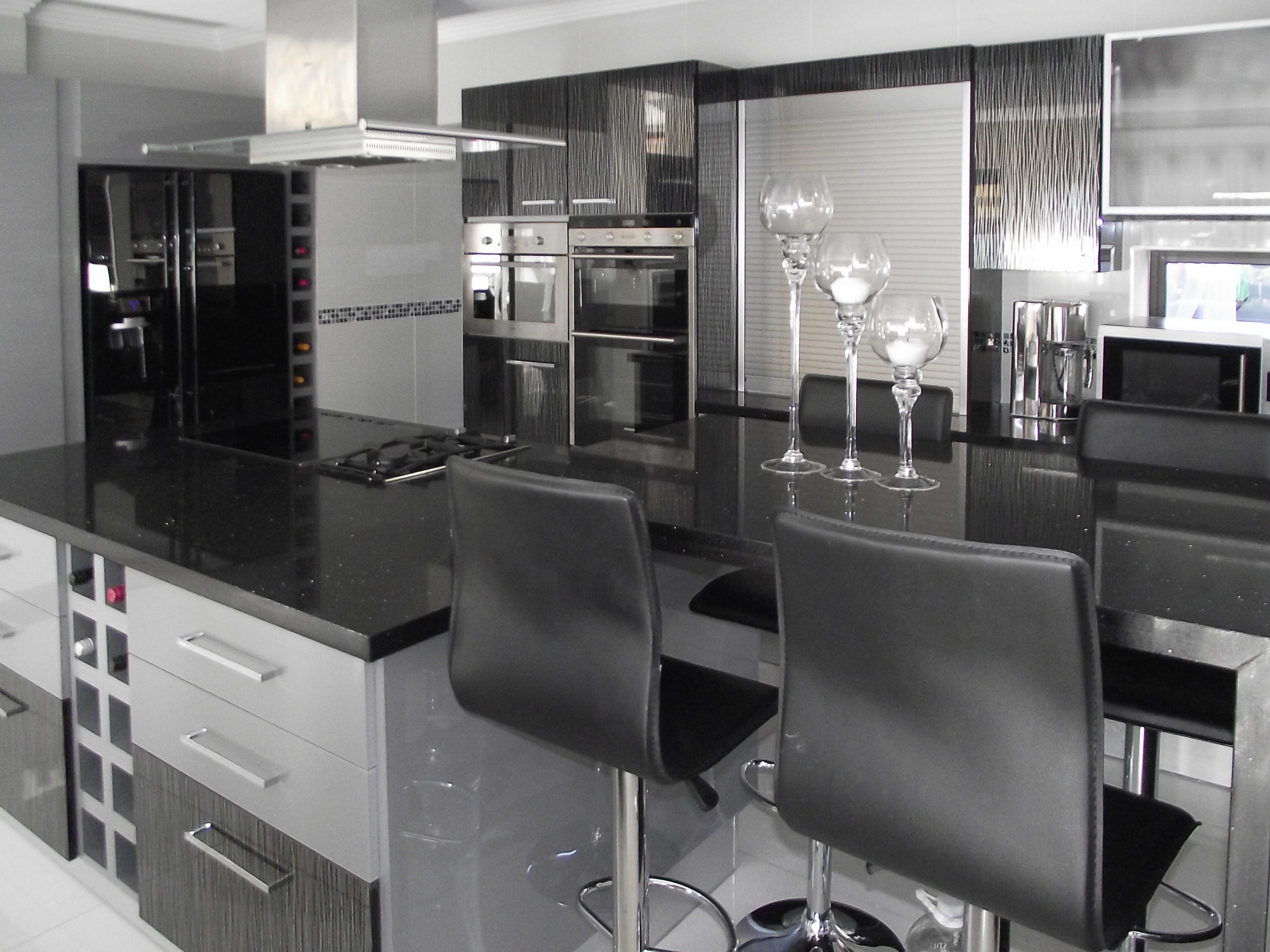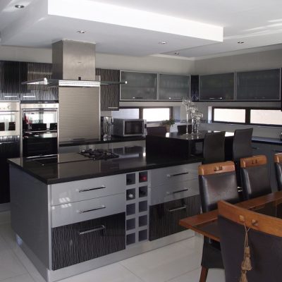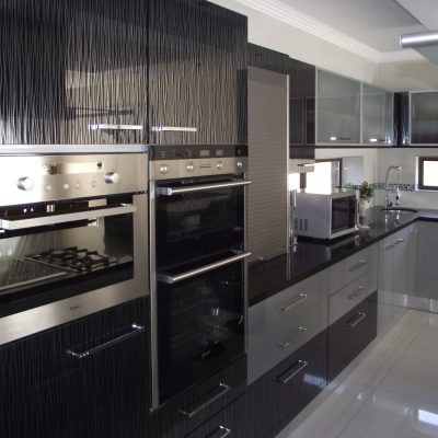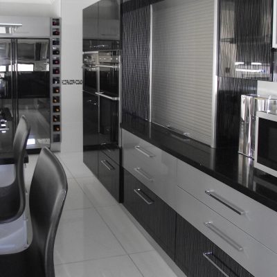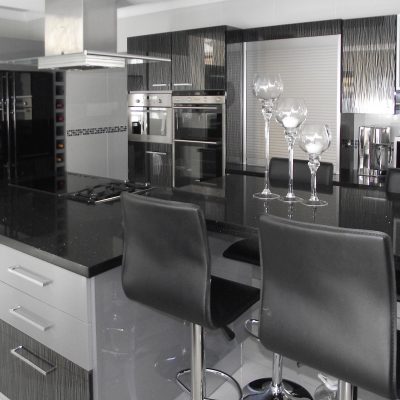 Our clients spared no expense when deciding on this ultra modern kitchen. The cupboard doors are covered in a black and silver contrasting design with a high gloss finish. We made the most of the space by putting in a roomy larder unit for grocery storage and made sure to provide lots of counter space. The kitchen is finished off by a large island with built in oven and attached seating area.