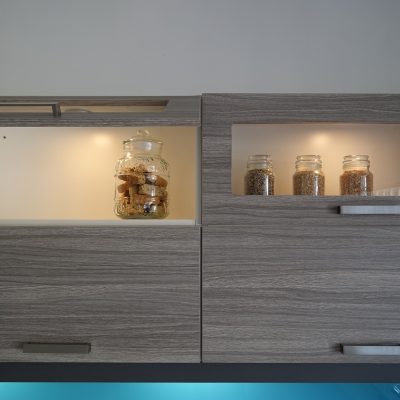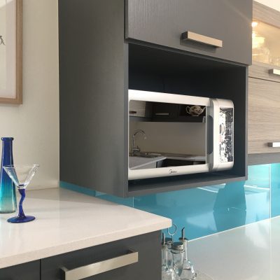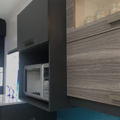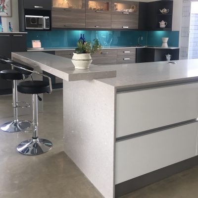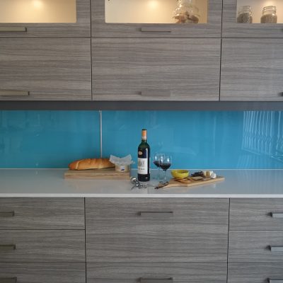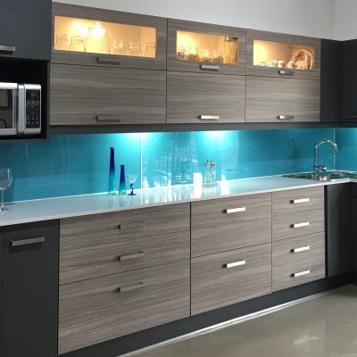 Blue acrylic wall cladding adds a splash of colour to this kitchen. Meanwhile upper flap units, with back lighting, match the drawers for consistent lines and design. This two-tone modern kitchen is finished with a white quarts counter and a corner sink.